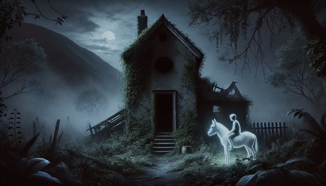 Depuis cette tragédie, la légende raconte que chaque nuit, à minuit pile, un phénomène étrange se produit près de la maison en ruine. Le fantôme d’une mule blanche apparaît, frappant du pied le seuil de la porte, comme si elle attendait quelqu’un. Soudain, l’âme de l’enfant apparaît à la petite lucarne. Il regarde autour de lui, grimpe habilement sur le rebord de la fenêtre et se rend sur le toit, d’où il se lance dans le vide. Il atterrit sur le dos de la mule, et ensemble, ils s’éloignent à une vitesse folle, disparaissant dans l’obscurité de la nuit.